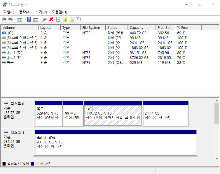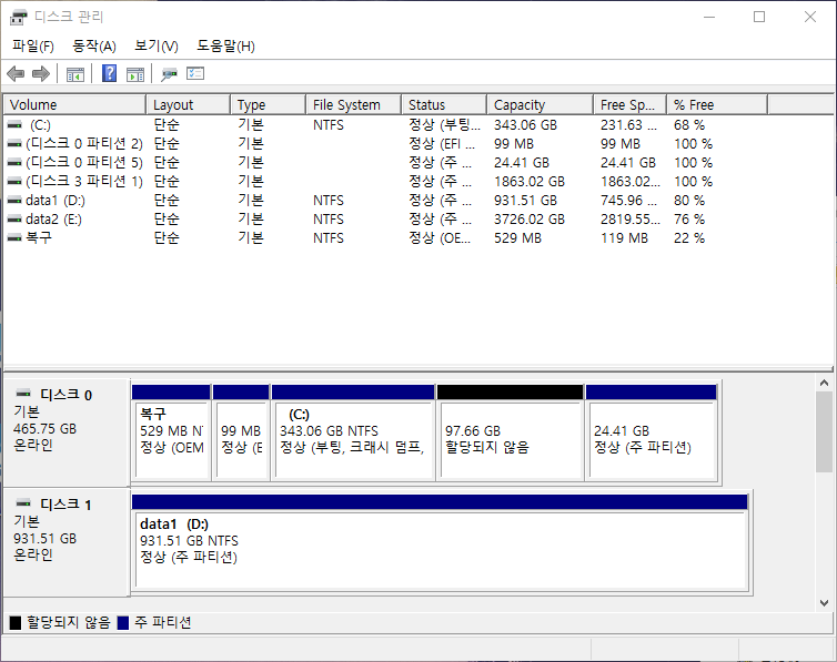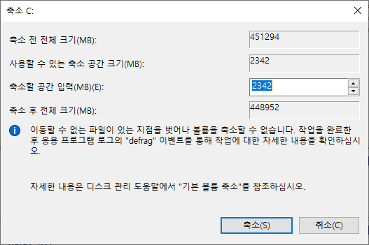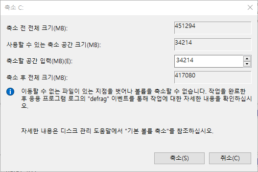 디스크 관리(맨처음 그림)에서 컴퓨터한테 이 파티션 축소하자 고 하면 얼마나 축소 할 수 있는지 검사한다.
