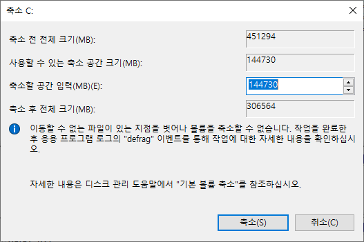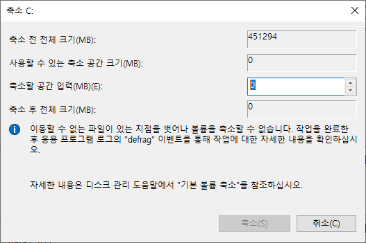 C드라이브의 파티션 용량을 줄이려함. 남은 용량도 300기가 정도인데도, 사용할 수 있는 축소 공간 크기가 0임. 축소가 안됨.
