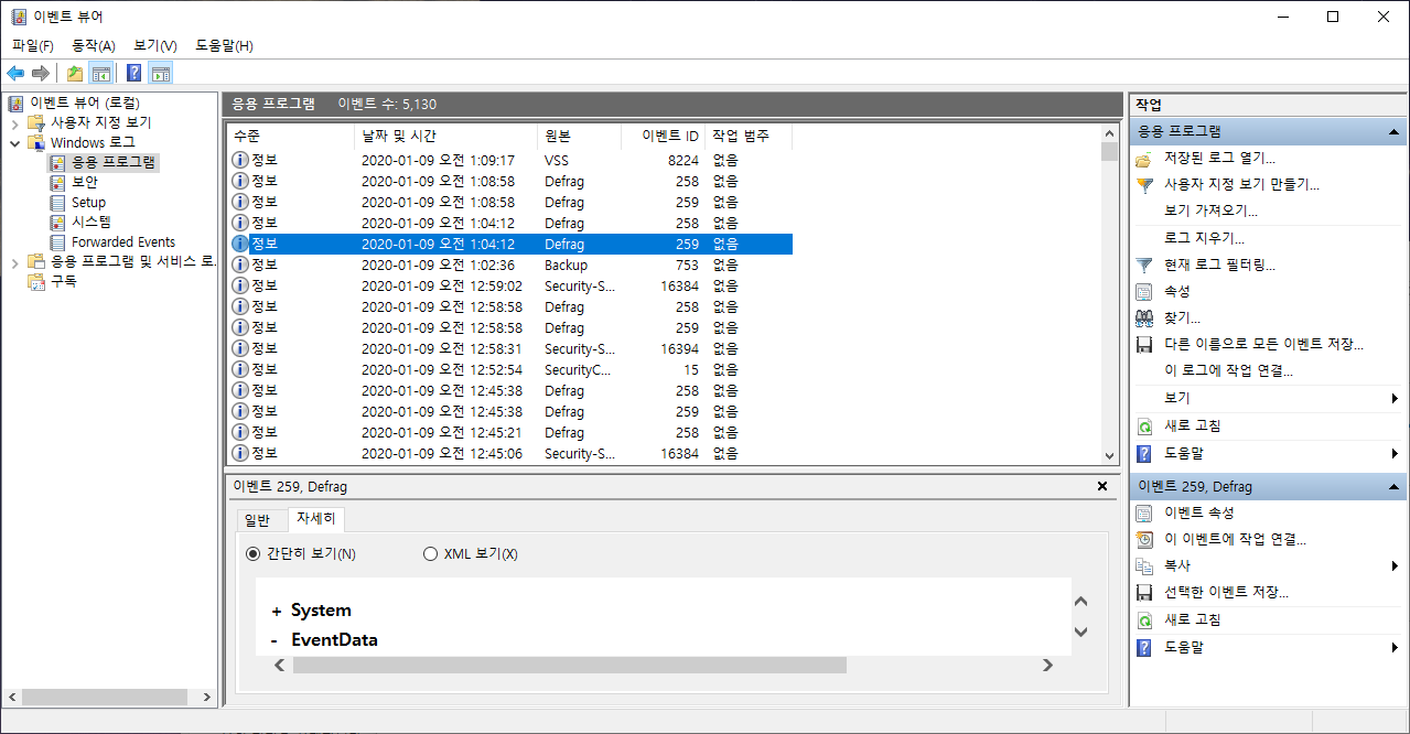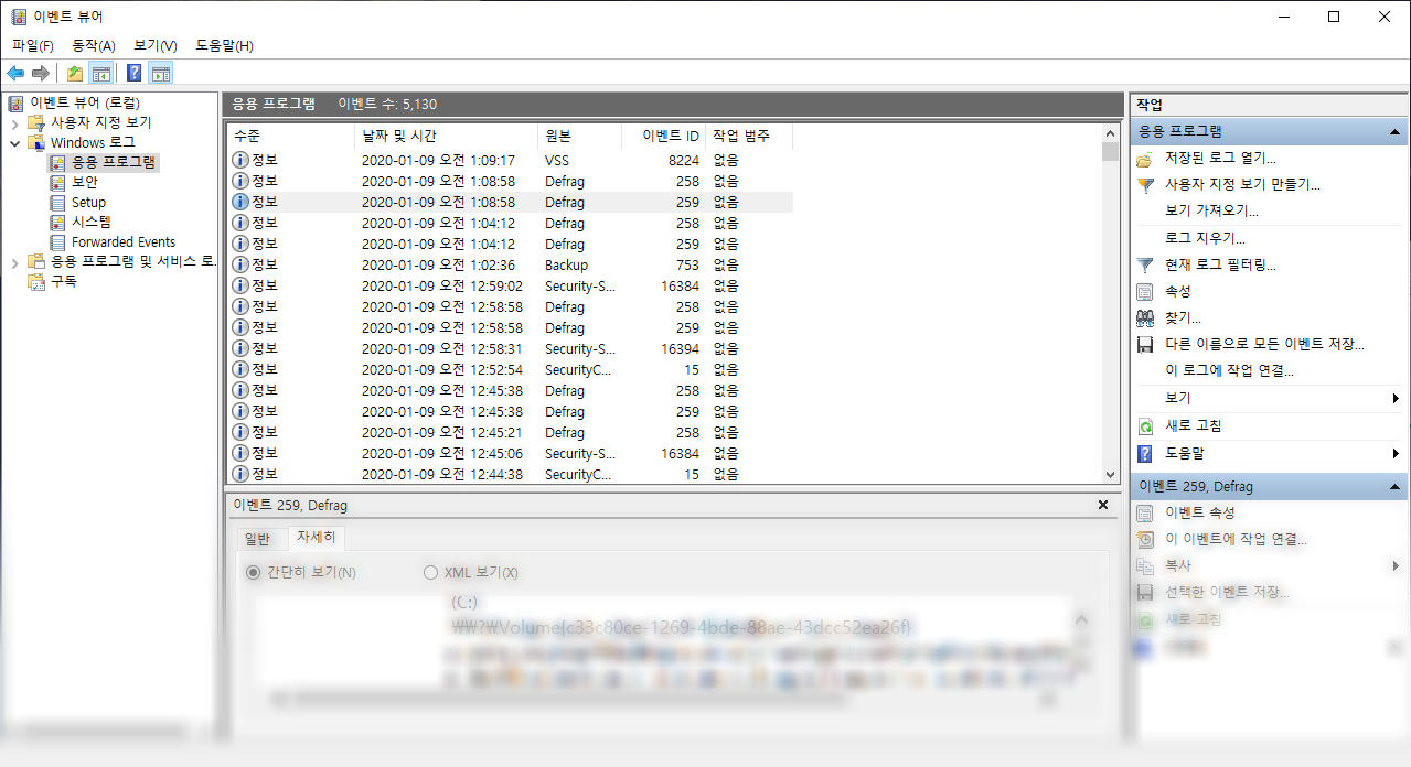 이벤트 뷰어에서 "defrag" 이벤트중 ID가 259인 애들을 찾아보고