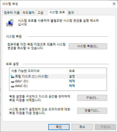 3) "시스템 보호" 탭의 "구성" 버튼 클릭