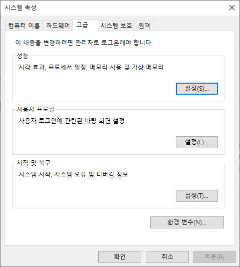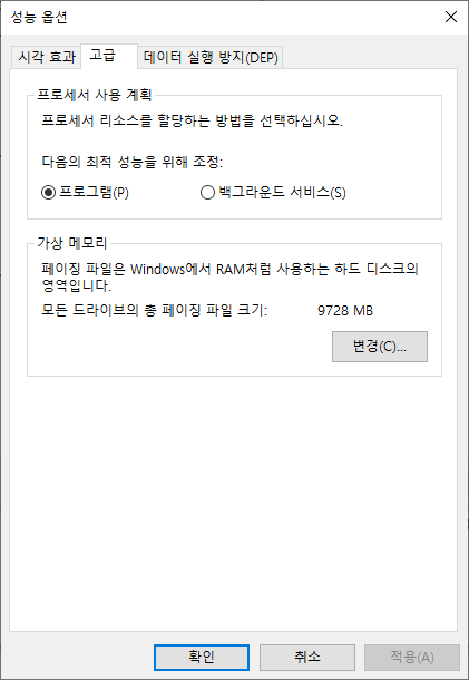 4) "고급" 탭의 "가상 메모리" 란에 있는 "변경" 클릭