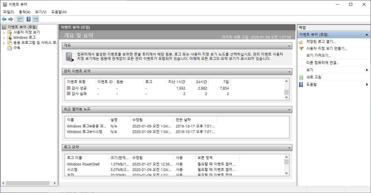 1) "윈도우키"를 누르고 "이벤트 뷰어" 를 쓴 뒤 엔터를 치면 다음 창이 나타남.