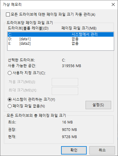 내 컴퓨터는 메모리가 충분하다보니 가상메모리를 설정할 필요가 없었기에 변화 없음.