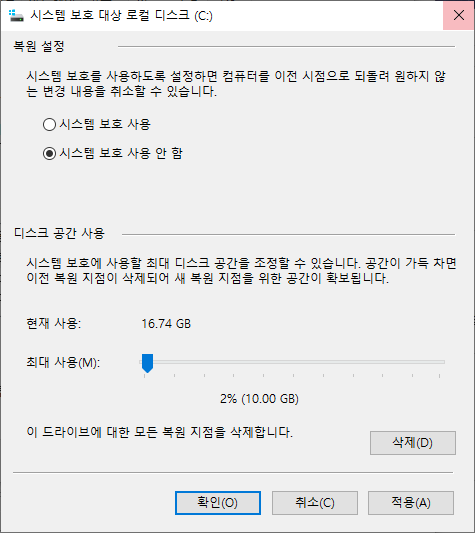 4) "복원 설정"의 "시스템 보호 사용 안 함" 버튼 체크 후 확인